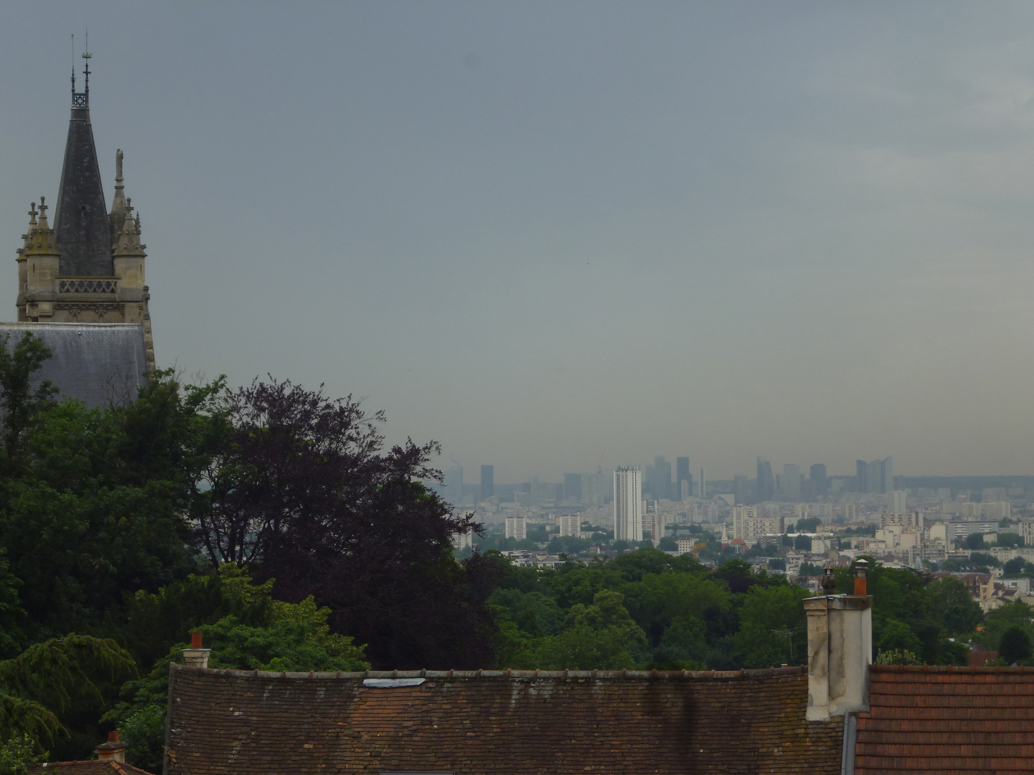 Des toits de Montmorency, je peux apercevoir les tours de la Défense, au loin. Elles sont très hautes et un peu bleues. Là bas, les gens, qui portent des costumes, s’affairent sûrement. Ils doivent prendre l’ascenseur souvent et porter de gros dossiers. Ils sont toujours stressés quand ils pensent à leur patron. Ils attendent le soir, pour rentrer en métro. Ici, tout est plus tranquille. Sous un arbre, je joue avec un petit chat gris. Après, je reprendrai ma promenade et j’irai voir papi.