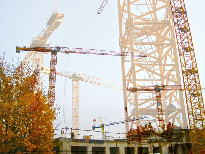 Les grues sont là. Elles sont les génitrices d'un éventuel patrimoine en devenir. En effet leur activité donne naissance au bâtiment. Quel qu’il soit, ce dernier, contemporain aujourd'hui, pourra, s'il perdure dans le temps, s'intégrer au patrimoine de demain. Par ailleurs le contraste entre les grues effacées et celles matérialisées confère à la photographie un mouvement et donc une certaine temporalité. C'est effectivement la prise en compte de cette même dimension qui permet d'intégrer ou non une architecture au patrimoine. Ainsi, ces engins de chantier matérialisent-ils une idée ; ils renvoient par métonymie à la ville en chantier permanent, où toute construction d'aujourd’hui est un potentiel héritage en devenir.