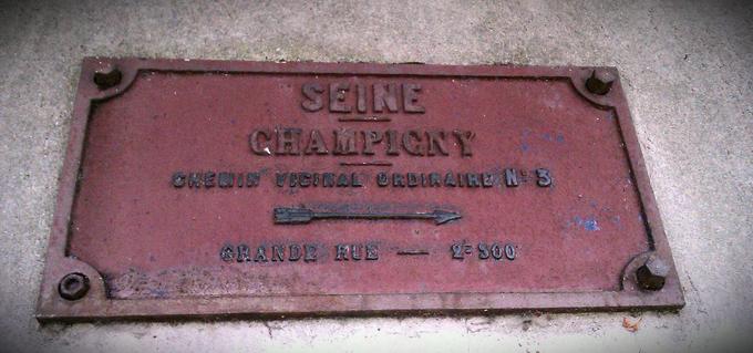 Entre les boucles de la Marne et le plateau de la Brie, Champigny-sur-Marne fut longtemps un petit bourg rural vivant d’agriculture : blé dans la plaine et vignoble sur le coteau depuis ses origines qui remonteraient à l’époque romaine. Aujourd’hui, Champigny est une commune résidentielle de la proche banlieue parisienne. Elle a presque complètement perdu son caractère rural cependant il existe toujours de petits indices à droite à gauche d’une histoire plus ancienne. C’est le cas de cette plaque rescapée du département de la Seine signalant le « chemin vicinal ordinaire n°3 » qui n’existe plus dans la terminologie officielle mais nous indique toujours la Grand Rue et ses 2,3 kilomètres !