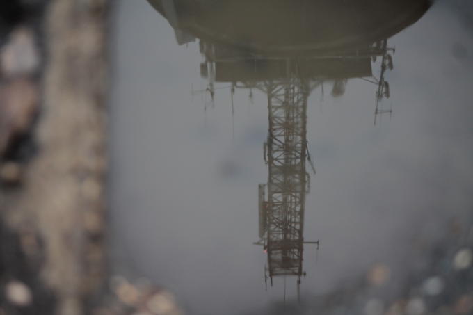 Prise de vue de la tour hertzienne de Meudon dans le reflet d'une flaque d'eau. Quand la terre et le ciel se rejoignent...