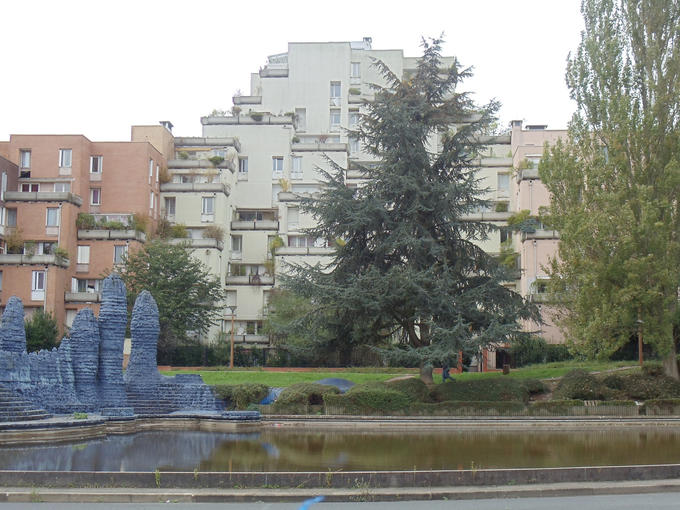 Ca y est : l’eau a enfin jailli des stalagmites et est venue alimenter le lac ! Cela ne se produit que quand il pleut beaucoup depuis que l’arrivée d’eau du bassin est coupée (c’était trop dangereux pour les jeunes enfants) et à ce moment là, je trouve mon quartier encore plus beau et joyeux que d’habitude. J’oublie les bâtiments qui m’entourent, j’ai l’impression de sortir de la ville et de m’évader au bord d’un lac au pied d’une pyramide d’Égypte. Ce lieu est très convivial dans le quartier. On vient s’asseoir sur les marches près des bosses bleues pour discuter, échanger et cela en toutes saisons, aussi bien quand le bassin est asséché sous le soleil de l’été qui se réverbère sur l’immeuble aux couleurs chaudes, qu’en automne où la végétation prend la couleur de la Pyramide, qu’en hiver quand une fine pellicule de glace recouvre cet ancien plan d’eau et qu’au printemps où la vie se réveille peu à peu et où les balcons refleurissent !