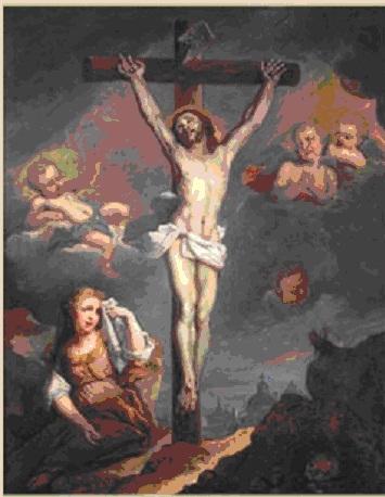 Ce tableau représente une scène religieuse : La madeleine au pied de la croix, où Jésus Christ est crucifié. Le style de cette peinture est baroque. Il y a beaucoup de contrastes de lumière et de ténèbres. L’atmosphère est sombre (beaucoup de nuages gris), l’ambiance est triste (la Madeleine à l’air de pleurer et les anges ont l’air inquiet). On ne sait pas d’où vient la lumière, ni si c’est le jour ou la nuit. Le regard est attiré par le visage de la Madeleine qui est lumineux et par le corps du Christ qui est lumineux également. La ville au loin donne de la perspective au tableau. Les couleurs utilisées sont le blanc pour mettre en valeur les personnages, le gris-bleu pour l’ambiance et le marron pour le décor et les vêtements. Cette œuvre a une référence biblique.