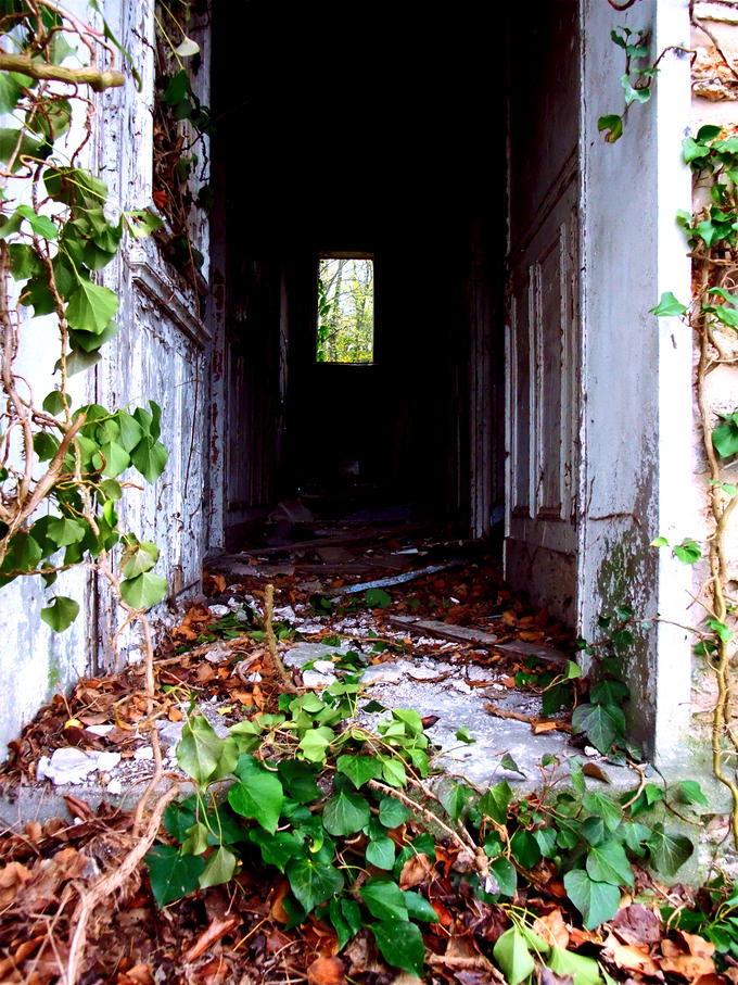 Dans cette maison abandonnée par l’homme, le végétal semble s’inviter dès l’entrée. Le sol est jonché de feuilles, mortes elles aussi. La végétation pousse le long des murs décrépis, pénètre dans le couloir, s’incruste dans la moindre fissure. Elle revient. Les fuyantes captent le regard qui s’engouffre dans une fenêtre, au centre de l’image, vers cette ultime issue : la nature. C’est par son emprise que la nature nous donne à réfléchir. Le patrimoine ne peut espérer durer que si, dès sa conception, on a tenu compte de la nature présente avant lui. Là où la nature reprend ses droits, l’homme est invité à repenser sa mainmise sur elle.