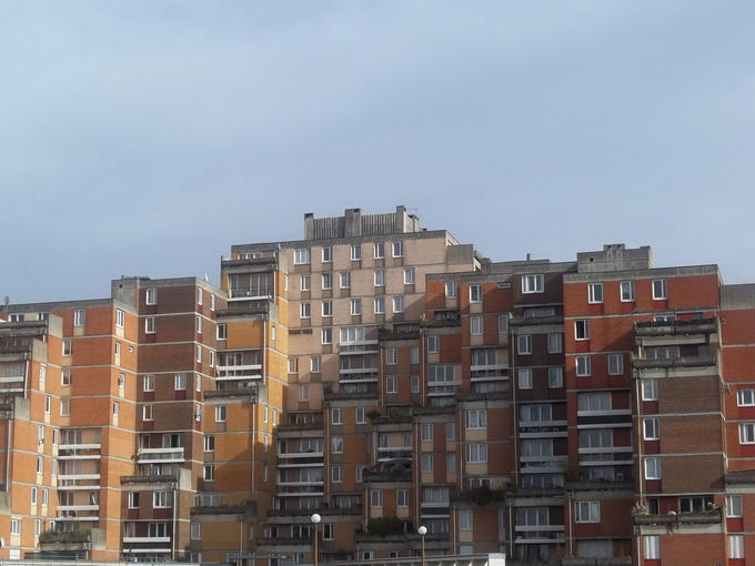 Cette photographie illustre la volonté de l’architecte qui était de superposer les balcons en diagonale pour que les rayons du soleil atteignent tous les étages. Cette pyramide est la plus haute de tout notre quartier. Sur cette image, on observe les rayons du soleil. Les couleurs que l’on voit sur cette Pyramide sont symboliques : le rouge représente le feu, l’orange la couleur du coucher de soleil, le marron la terre et le blanc les nuages. Cette Pyramide de différentes couleurs éclairée par la lumière du soleil représente, pour nous, les différentes cultures qui coexistent en harmonie dans notre collège et notre quartier.
