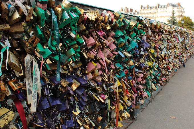 Les cadenas de l’amour envahissent les ponts de Paris, dont celui de l’Archevêché qui donne une vue imprenable sur la cathédrale Notre-Dame. De différentes formes, couleurs, prénoms, ils symbolisent un amour éternel. Derrière chaque serrure se cache une histoire particulière, marquée par un cadenas scellé à une rambarde, et une clé perdue au fin fond des mers. Je me prends à imaginer des histoires allant du roman d’amour au dramatique, personne ne sait qui sont ces gens, d’où ils viennent, et où ils en sont aujourd’hui. Un amour sous clé dont seuls deux personnes connaissent la vérité.