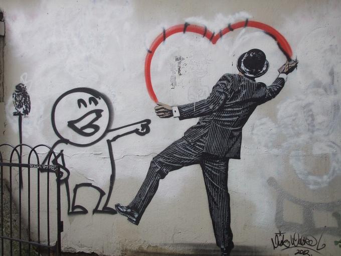 C’est au début de notre parcours que je suis tombé sur ce tag. Il m’a beaucoup inspiré car la représentation me paraît très artistique. Cette œuvre se situe rue Amelot, dans une cour ouverte au public qui longe un café au sud du Cirque d’Hiver. Elle représente un petit personnage au crâne rasé, la tête ronde et le visage laid, se moquant de son créateur en tendant un doigt moqueur, avec un sourire impressionnant. Le dessinateur se représente traçant un arc de cercle plus grand que lui-même (sûrement pour montrer la supériorité du dessin sur son créateur). Il est plus grand encore que l’étrange créature moqueuse au sourire exagéré. Il est vêtu d’un chapeau melon couronné d’un tissu noir. Il porte une chemise blanche et un costume gris foncé rayé. Les plis de ses vêtements sont magnifiquement bien représentés. Il se tient sur une jambe déséquilibrée. Mais que va maintenant dessiner ce créateur ?