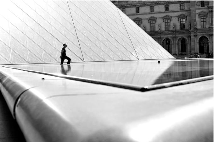 J’ai choisi de vous présenter cette image car elle mélange l’ancien et le contemporain. Le noir et blanc permet de renforcer le contraste au niveau de la lumière et donner du relief à mon image. La pyramide se reflète dans l’eau et créée une nouvelle perspective qui renforce celle du rebord de l’eau. Quant à l’homme se trouvant sur ma photographie, son regard crée une nouvelle ligne directrice (fuyante) qui nous emporte du côté droit de l’image. L’architecte est influencé par les courants architecturaux privilégiant les formes géométriques et fonctionnelles. Il explique ce souci de revenir à des formes simples par sa culture chinoise.