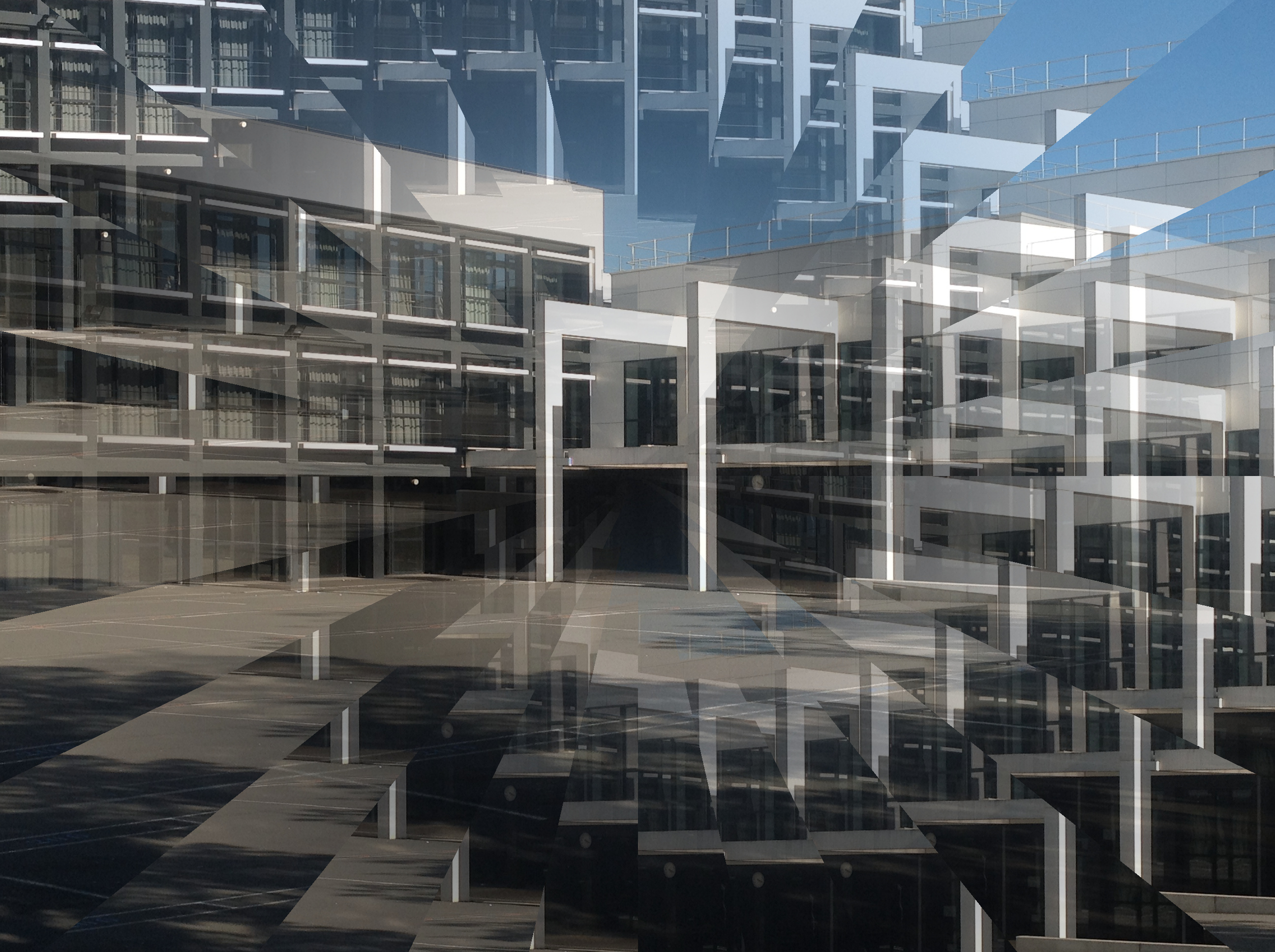 On a pris cette photographie car elle transforme notre vision du collège Jacques Daguerre, et elle nous donne l'impression d'optique que les piliers et l'architecture toute entière tourbillonnent et se multiplient à l'infini comme dans un jeu de miroirs.