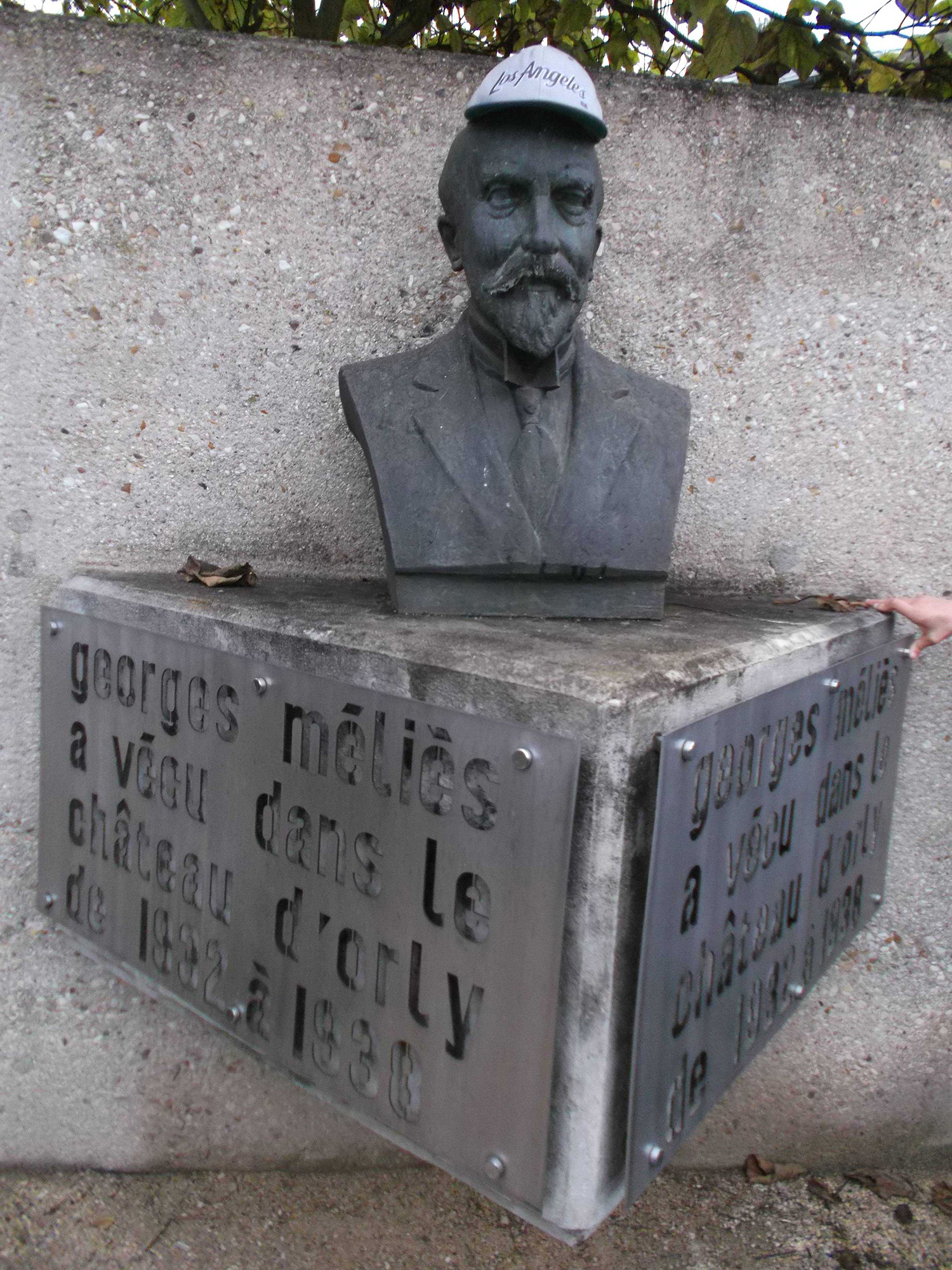 Nous avons choisi ce patrimoine car il représente un cinéaste célèbre qui a vécu à Orly : Georges Méliès, au XIXe siècle. Cette statue représente son portrait. On le décrit comme un « magicien du cinéma » car il a été le premier à expérimenter des effets spéciaux, et à raconter des histoires avec la caméra. Son film, « Le voyage dans la Lune », réalisé en 1902, est le premier film à avoir été classé au patrimoine mondial de l'Unesco. La casquette est là pour donner une vision nouvelle de ce personnage : pour le rapprocher de notre culture, car c'est la casquette d'un élève. Une école d'animation porte aujourd'hui le nom de Georges Méliès à Orly. Ainsi, sa magie opère encore un peu dans notre ville...