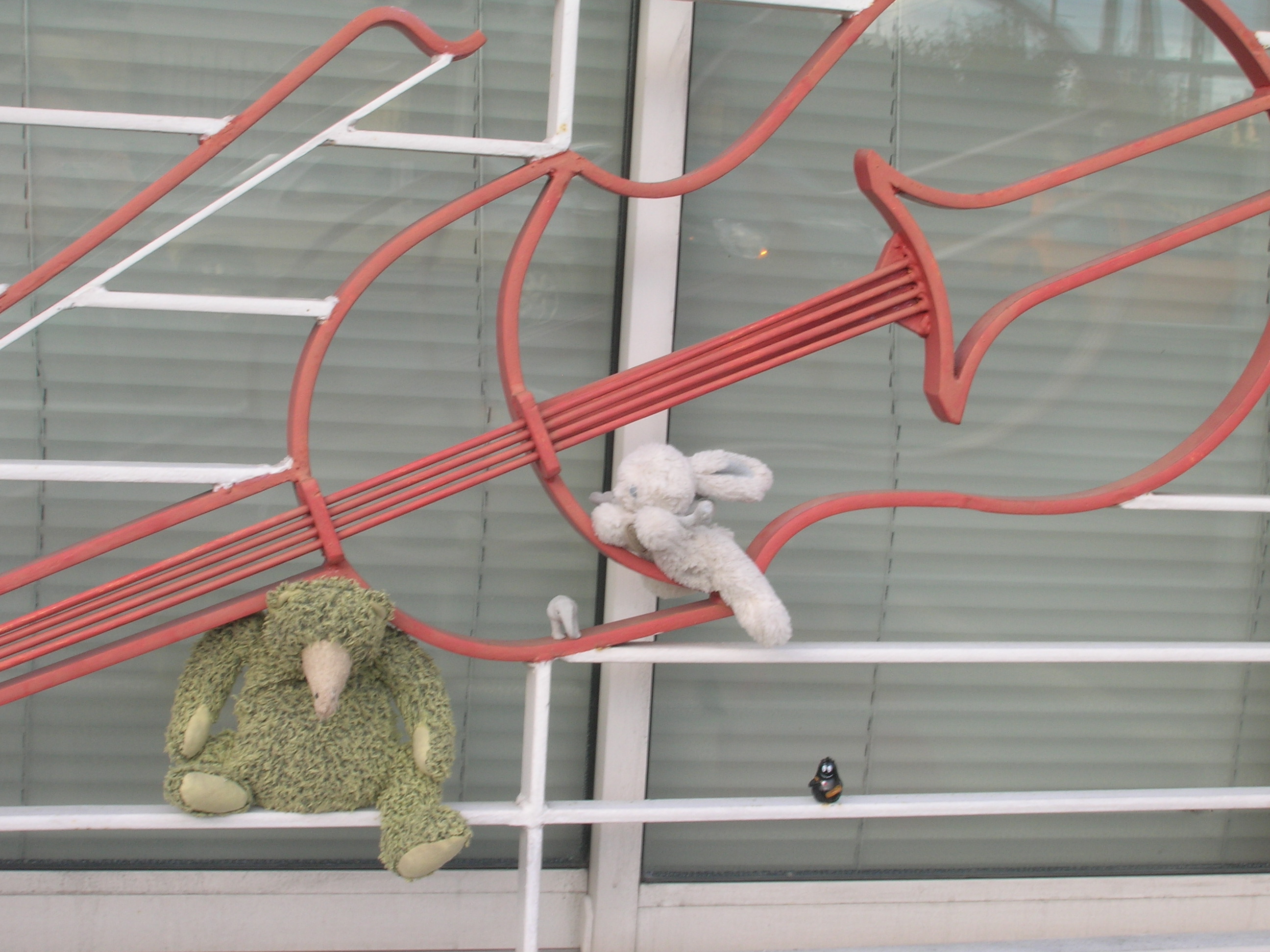 Un jour je me suis promené avec le doudou-mascotte de la classe, Jeannot-Lapin. On est allé au conservatoire pour lui faire écouter un concert. Il a voulu monter sur le violon qui décore le conservatoire avec son copain ours vert. J’aime aller écouter des enfants qui jouent du violon, de la guitare, de la batterie, mais surtout les grands qui jouent mieux. J’aime aussi la chorale des adultes avec Danièle à la fête de la musique ; ils chantent des chansons bizarres. Et les garçons en vert qui jouent du rock. Et puis maintenant, je joue des percussions.