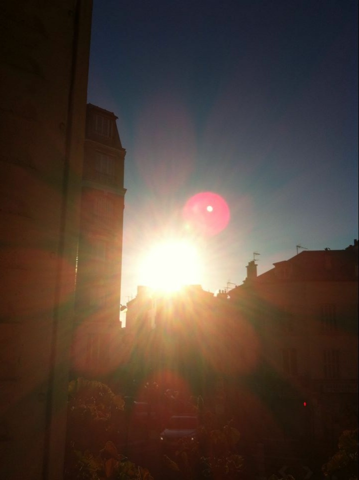 Lorsque je rentre du collège, fatiguée et l'épaule en compote, ce spectacle m'est offert depuis la fenêtre de ma chambre. Un magnifique tableau avec des dégradés de couleur jaune et rouge. Et quelques fois, lorsque les couleurs sont encore plus belles et plus vives, j'immortalise ce moment avec mon portable comme pour celui-ci. En fait, c'est presque devenu une habitude de photographier des couchers de soleil voire un petit passe-temps.