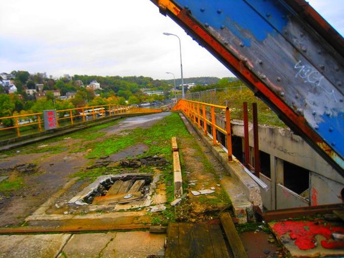 Cette photographie a été prise depuis le pont Seibert qui relie l'île Seguin à Meudon sur la rive gauche de la Seine. Depuis la fermeture de l'usine Renault en 1992, cette rampe d’accès est à l'abandon. Elle permettait autrefois d'amener les ouvriers et les camions dans la partie sombre et mystérieuse de l’île.