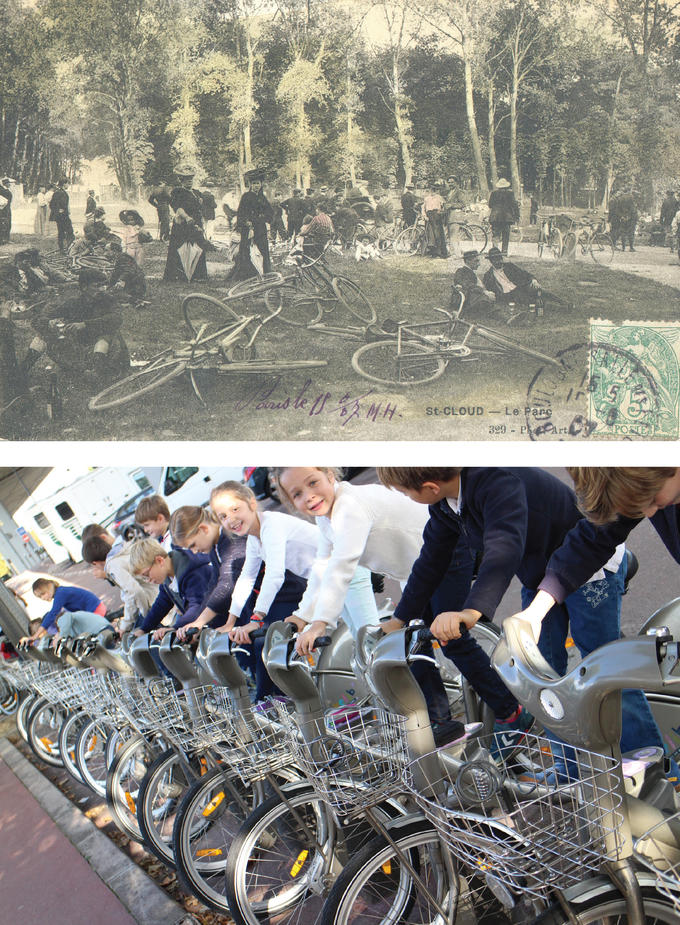 Sur cette photo, nous découvrons les Vélib'. Malgré la topographie de notre ville colline, nous sommes des grands sportifs et pratiquons le vélo toutes les semaines dans le Parc de Saint-Cloud comme les personnes que vous voyez sur la carte postale ancienne.