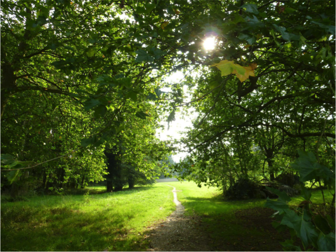 Mon chemin est illuminé par le soleil couchant. Un arbre surplombe la scène verdoyante située dans une forêt près de chez moi. Étant petite j'y faisais pleins de balades. J'y ai passé d'agréables moments. La forêt est comme mon élément. C'est des balades, des sorties, des soirées, des pique niques et de bons moments partagés avec mes proches. C'est le paysage de mon patrimoine qui correspond à un agréable lieu rempli de souvenirs selon moi. Souvent, je repasse par cet endroit merveilleux et à chaque saison, chaque détail change. On peut y voir des oiseaux, des papillons, des limaces, des feuilles