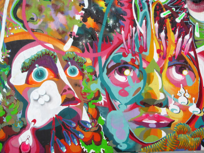 Un graff abandonné sur le quai de la seine au pied de la BNF, je ne sais pas qui l’a tagué mais l'auteur a beaucoup de talent. Cette œuvre urbaine colore les quais souvent gris de Paris. On voit deux personnages très colorés. Il y a beaucoup de couleurs dans l’œil du personnage de gauche. Le personnage de droite à l’air de penser à quelqu’un, l’autre personnage à l’air étonné. Je voudrais qu’ils me parlent pour que je puisse les découvrir encore plus. Emma, Paris, XIIIe.