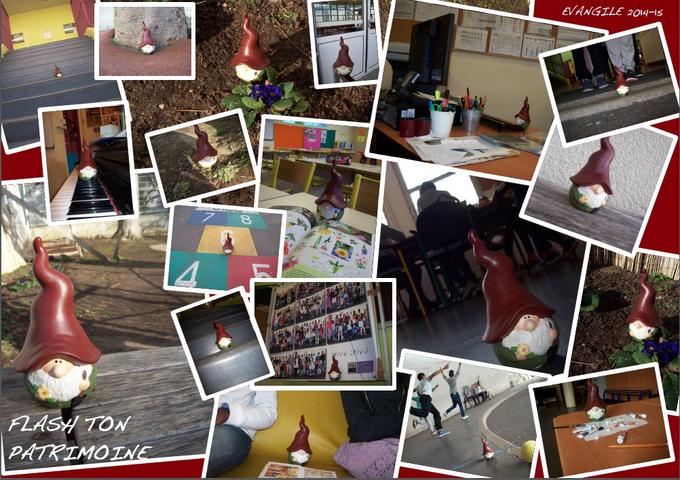 Tel le nain dans le film Amélie Poulain, notre nain Dumpty visite notre école (la classe, la bibliothèque, la cour de récréation, le couloir, la salle de musique, ...). Il vous présente notre cher école.