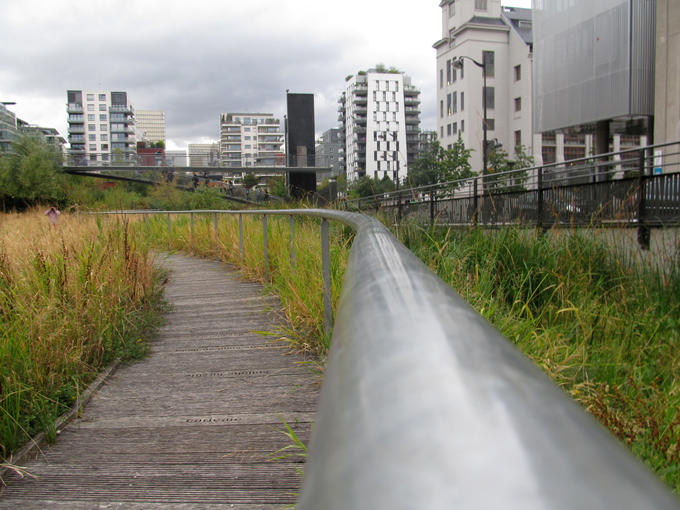 Il y a beaucoup d’immeubles dans mon quartier, la barre tourne et m’emmène au profond des immeubles. L’image a été prise dans un parc dans lequel je joue souvent. J’habite dans le XIIIe arrondissement de Paris, le nouveau quartier de la Bibliothèque François Mitterrand. Je vois le pont qui est tendu et droit, et aussi l’ascenseur pour les handicapés qui se situe dans la tour noire. Ma photo avance vers le loin. Albin, 7 ans.