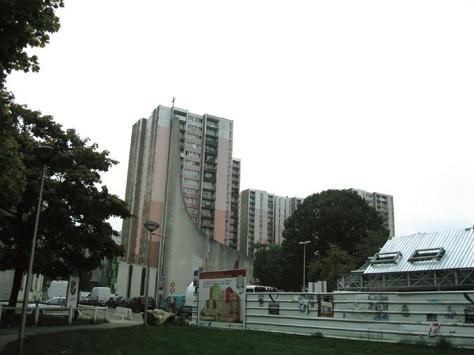 C’est la cité Karl Marx. Elle est située en plein cœur du centre-ville de Bobigny. Elle a été construite en 1970. Il y a des immeubles roses et blancs. Devant la cité Karl Marx, il y a une église appelée Saint-André. Elle est à Bobigny, au 5 avenue Karl Marx. C’est une église faite en béton. Elle est très jolie. C’est une église comme une tour, avec une croix. Sur la photo, je vois aussi des arbres, des voitures, trois lampadaires qui grimpent vers le ciel, comme l’église. Il y a une maison avec un toit de tôle et une palissade avec des affiches déchirées. Le ciel est sombre.