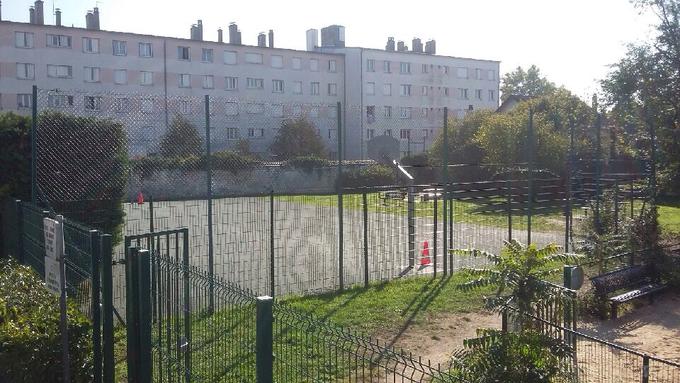 Le square Guynemer surtout connue sous le nom de square d'Yves Farges du nom de la cité qui se trouve derrière est donc composé d'un petit parc pour enfants avec des structures adaptées (il y a aussi un bac à sable) ainsi qu'un terrain de basket (celui présent sur la photo). Ce terrain de basket que vous pouvez voir est un terrain de basket que nous remodelons aussi en terrain de foot avec les jeunes de la cité en fond en prenant des plots oranges de chantier et que nous mettons à une certaine distance du poto du panier de basket pour créer des cages de foot, et c'est là que l'on s'amuse quand il fait beau.