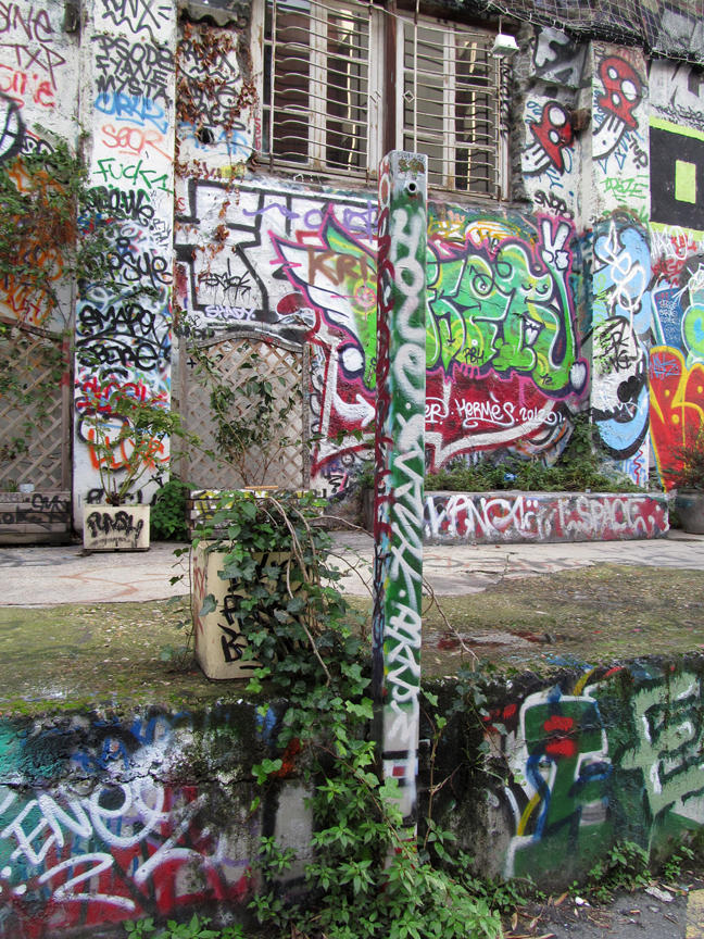 Sur les murs de mon quartier. Les couleurs se mélangent à la végétation. J’ai la chance d’habiter à côté d’un lieu qui a une histoire artistique : les frigos du XIIIe. Mon quartier est un lieu où se mélangent passé et présent. La cour est pleine de couleurs, les graffitis changent régulièrement, c’est un endroit vivant et qui est une histoire vivante. lea