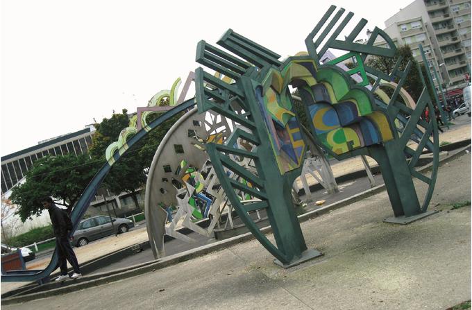 Je suis très content de faire la description d’une sculpture de Bobigny. Cette œuvre s’appelle Mémoire vive et commémore la Libération. D’ailleurs, elle se trouve place de la Libération. Elle a été imaginée en 1988 par un certain monsieur Zvenigorodsky. Elle est construite sur du béton. Au sol, il y a un cercle qui renferme des arcs de cercle en fer. Il y a Jeniskumar, un camarade de ma classe, qui marche. J’adore cette sculpture parce qu’elle est magnifique et multicolore. Il y a des schémas extraordinaires. Et il y a des mauvaises herbes qui poussent.