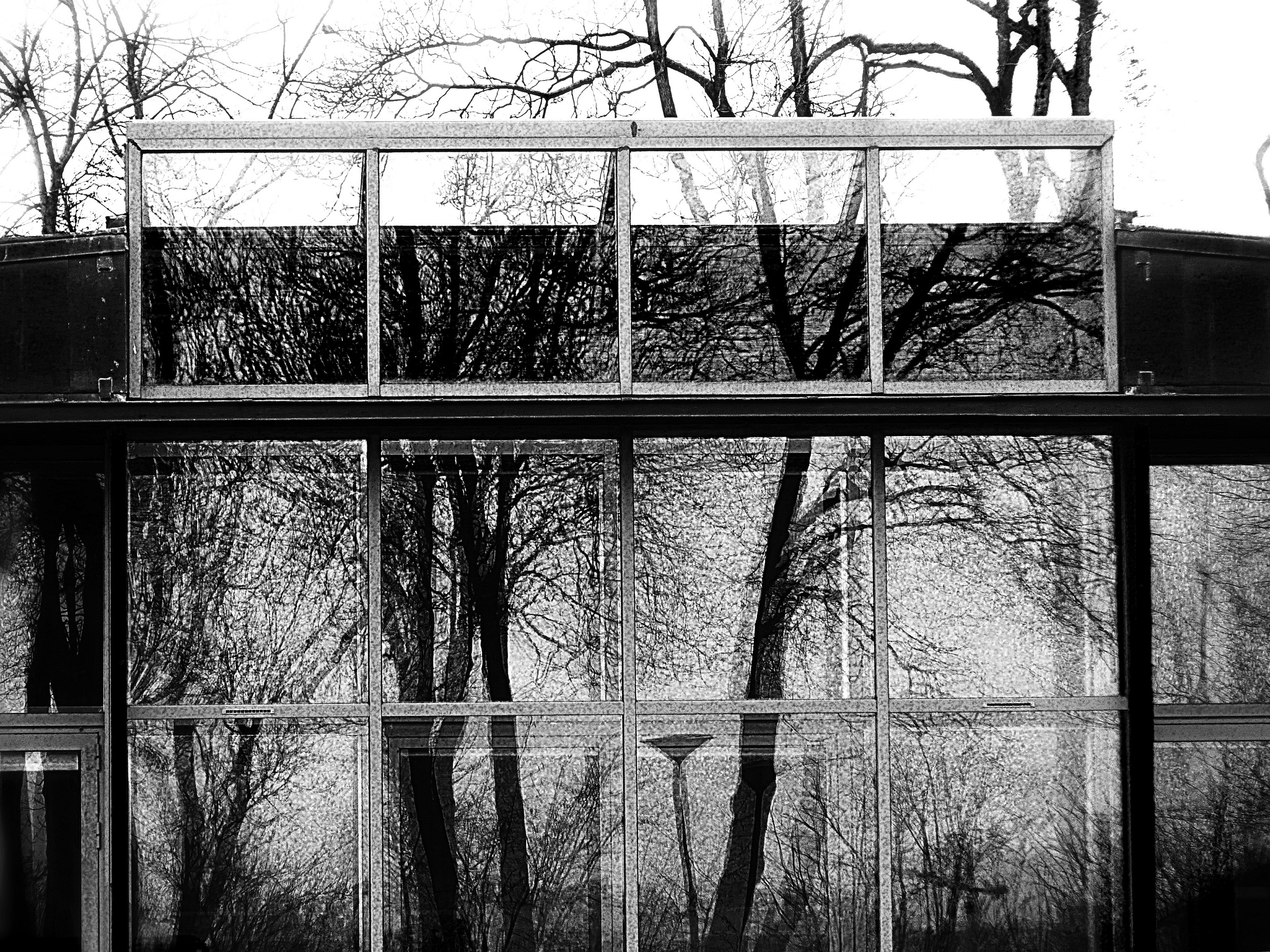 La végétation extérieure se reflète dans les vitres, la lumière fait rentrer la vie, attrape les ombres des arbres. Les branches se prolongent au - dessus comme faisant partie intégrante de cette structure géométrique.